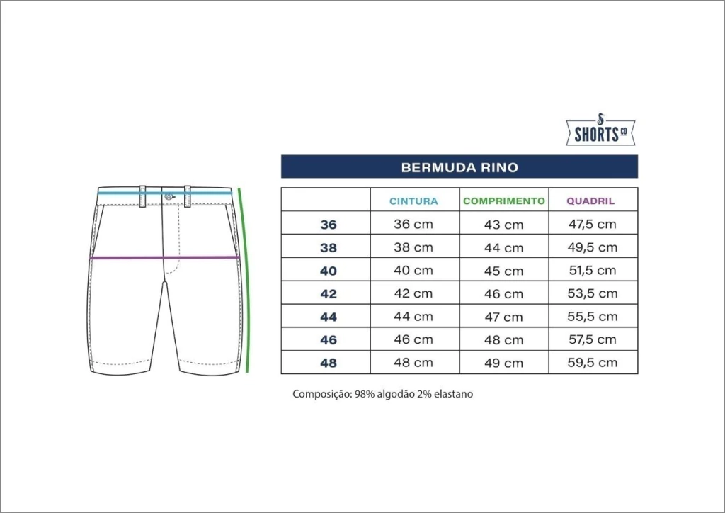 Nossa nova bermuda Rino masculino é uma peça de sarja tinturada com elastano, que garante conforto e flexibilidade.